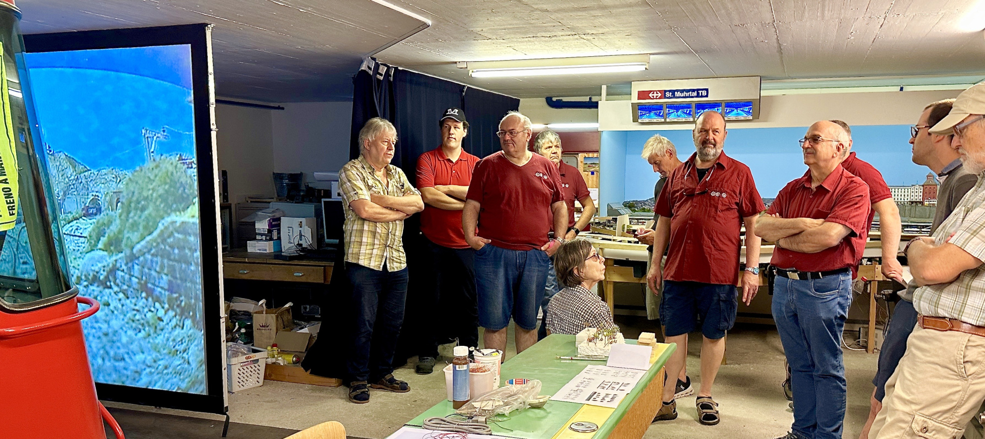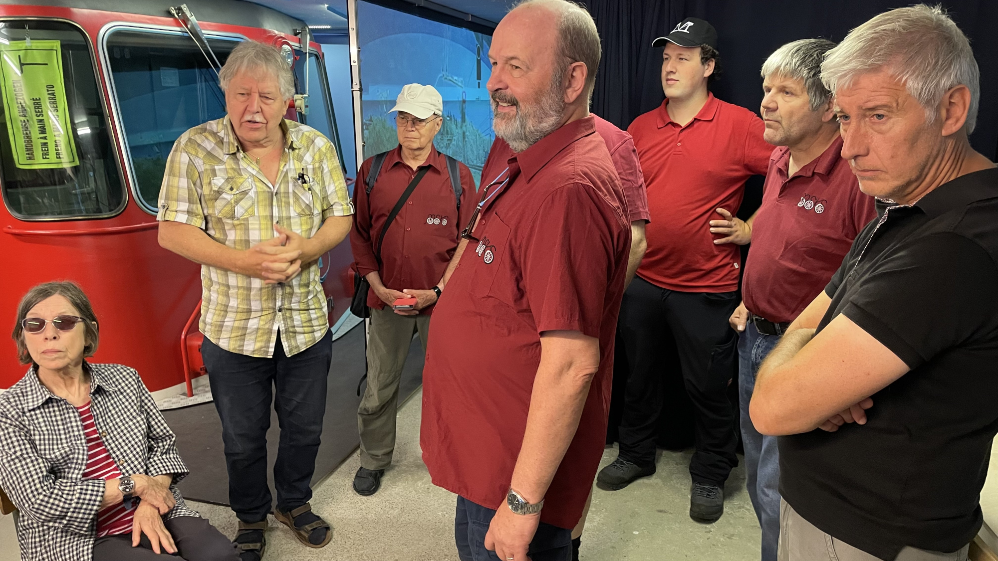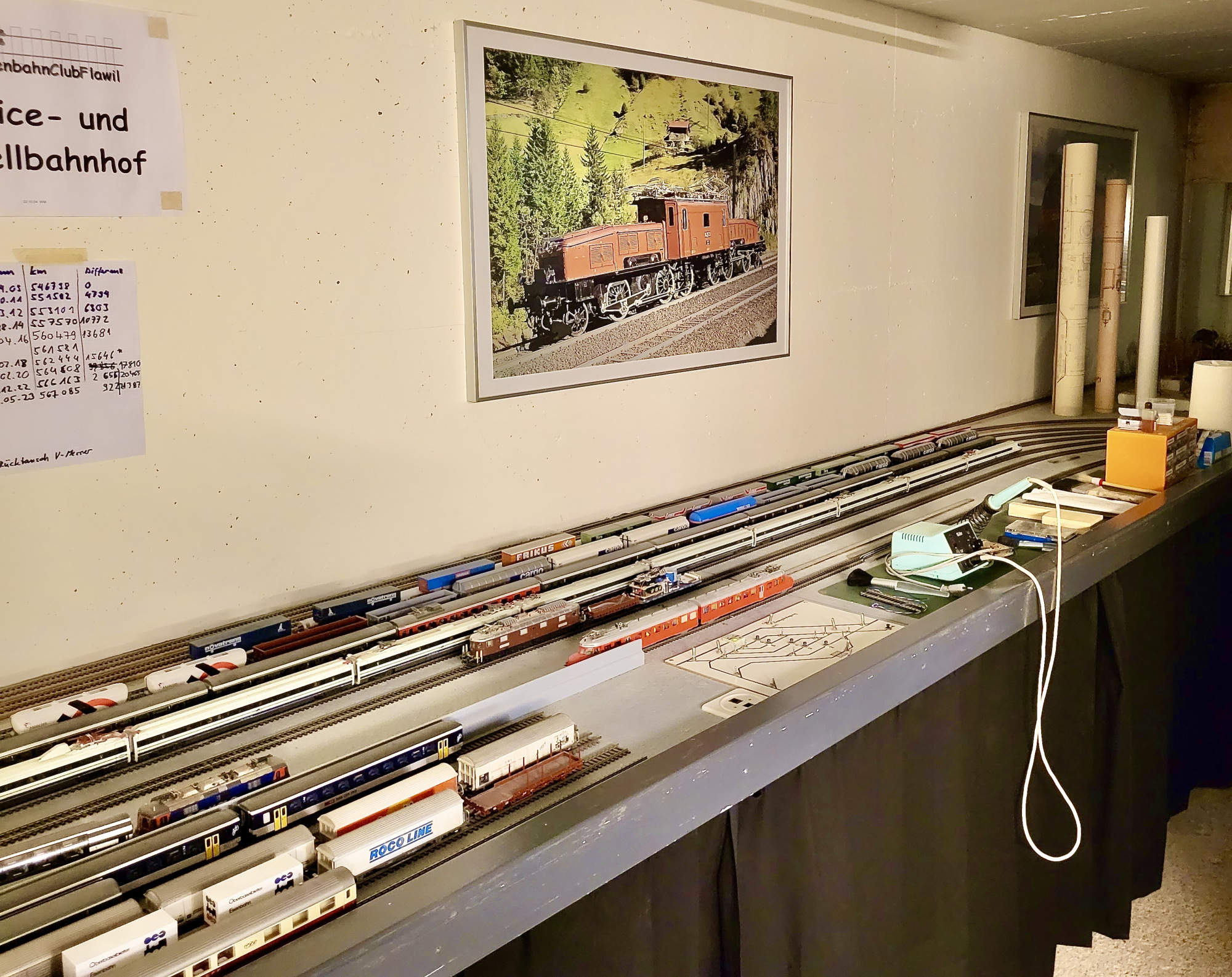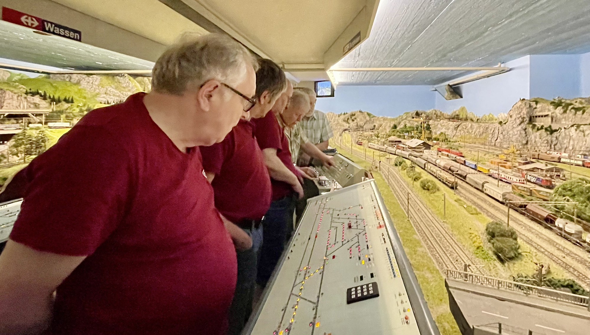 Präsident Philipp Geisser erklärte uns die perfekt gestaltete Modelleisenbahn-Anlage in Spur H0/H0m und zusammen mit Christian Heer demonstrierte er uns den Fahrbetrieb, die Stellpulte und den voll funktionsfähigen Führerstand einer Re 4/4 II. Wir staunten und waren überwältigt. Nach Mittagessen, viel «Bähnele» auf der Anlage und im Führerstand und Kaffee mit Kuchen fühlten wir uns so wohl und hatten so viel Spass und Freude, dass wir beinahe die Zeit vergassen und erst kurz vor 18:00 wieder unsere Rückfahrt antraten.