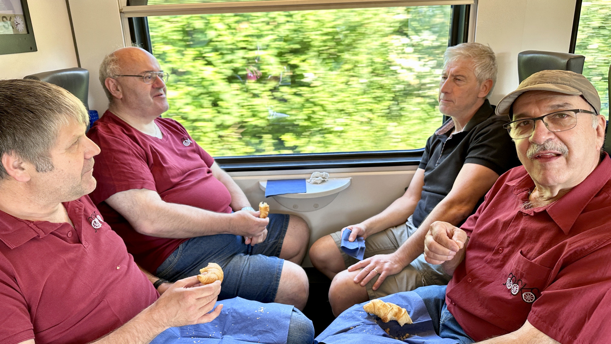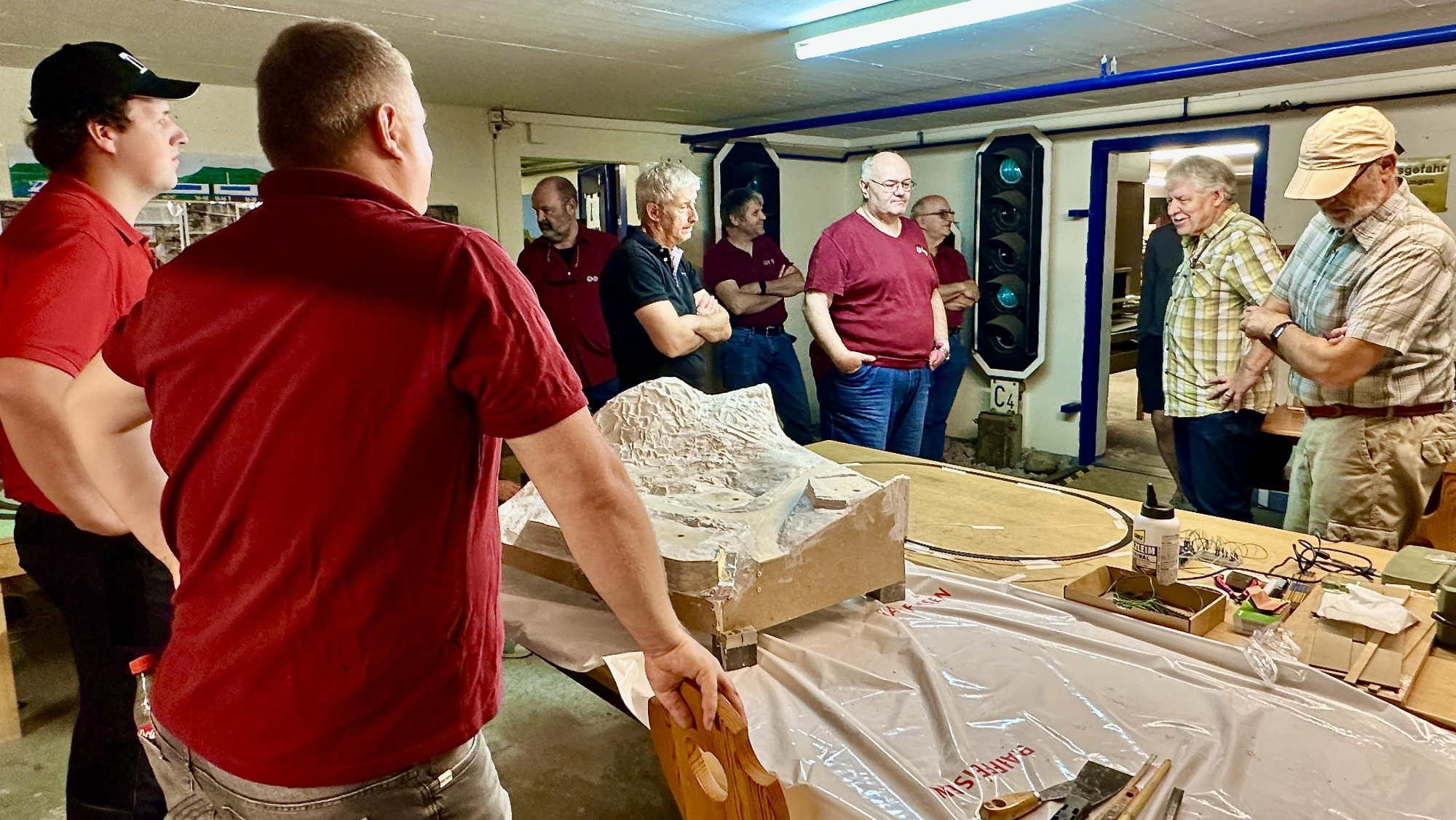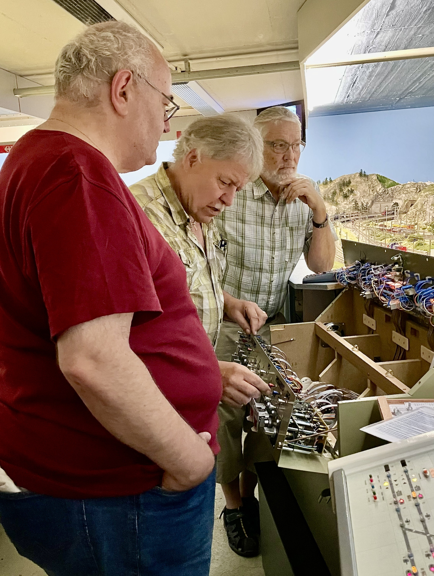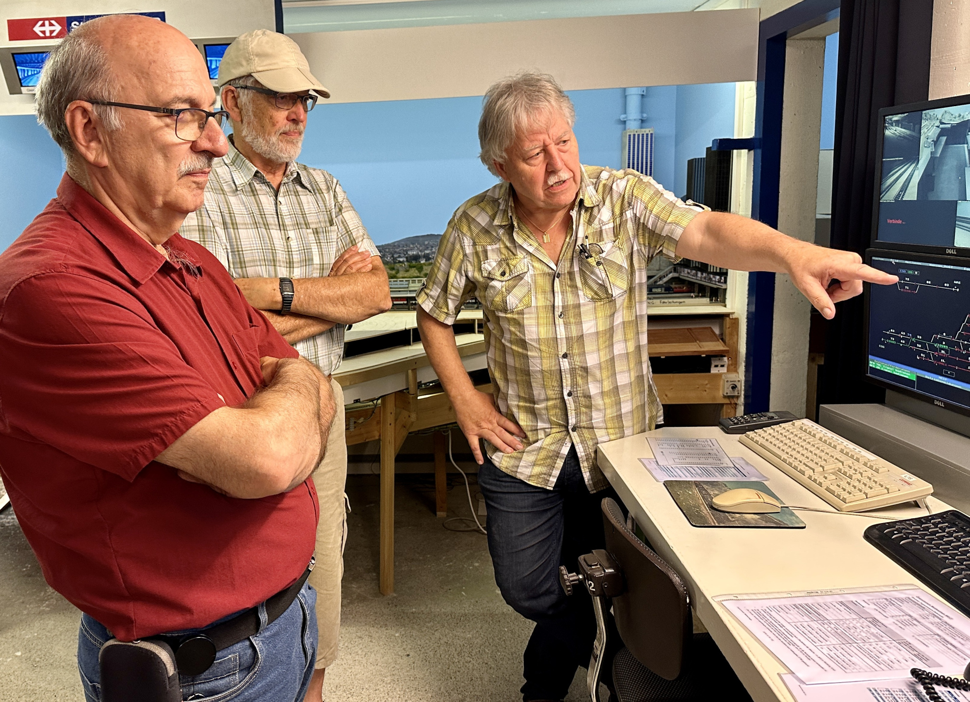 Präsident Philipp Geisser erklärte uns die perfekt gestaltete Modelleisenbahn-Anlage in Spur H0/H0m und zusammen mit Christian Heer demonstrierte er uns den Fahrbetrieb, die Stellpulte und den voll funktionsfähigen Führerstand einer Re 4/4 II. Wir staunten und waren überwältigt. Nach Mittagessen, viel «Bähnele» auf der Anlage und im Führerstand und Kaffee mit Kuchen fühlten wir uns so wohl und hatten so viel Spass und Freude, dass wir beinahe die Zeit vergassen und erst kurz vor 18:00 wieder unsere Rückfahrt antraten.